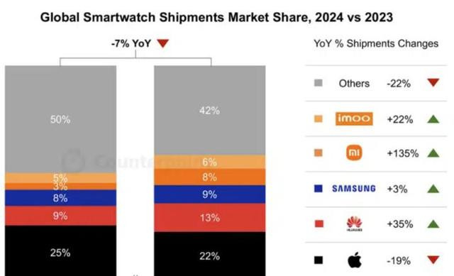 2023-2024年,苹果手表的出货市场占有率呈下降趋势,华为,小米等增幅最大
